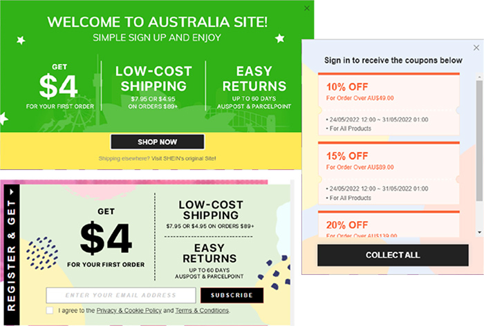 For example, Shein’s website forces users to navigate through three different pop-ups before you can browse its website. Other websites seem to watch where and how you move your cursor, so if it looks as if you’re about to leave, a pop-up will appear encouraging you to stay.Â