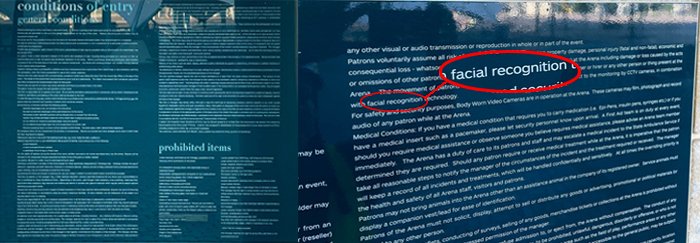 But these signs are not easy to find. We asked a CHOICE supporter who recently attended a Michael Bublé concert at the venue to be on the lookout for signage mentioning facial recognition and she reported that she was unable to spot them.Â