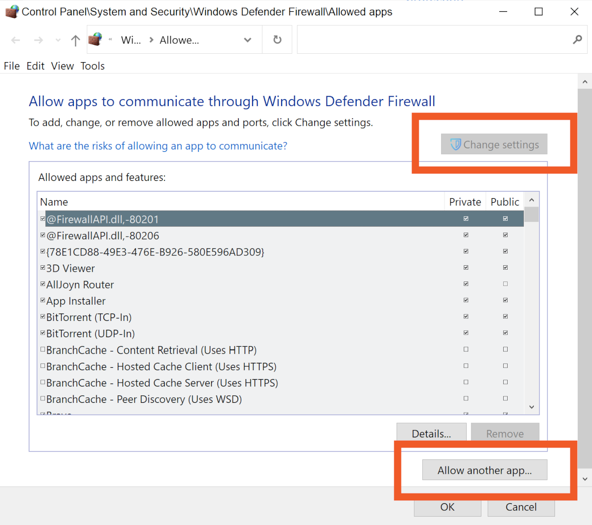 Click Change settings > Allow another app… and use the browse option to locate it, then click Open > Add. When you’re done, click OK.