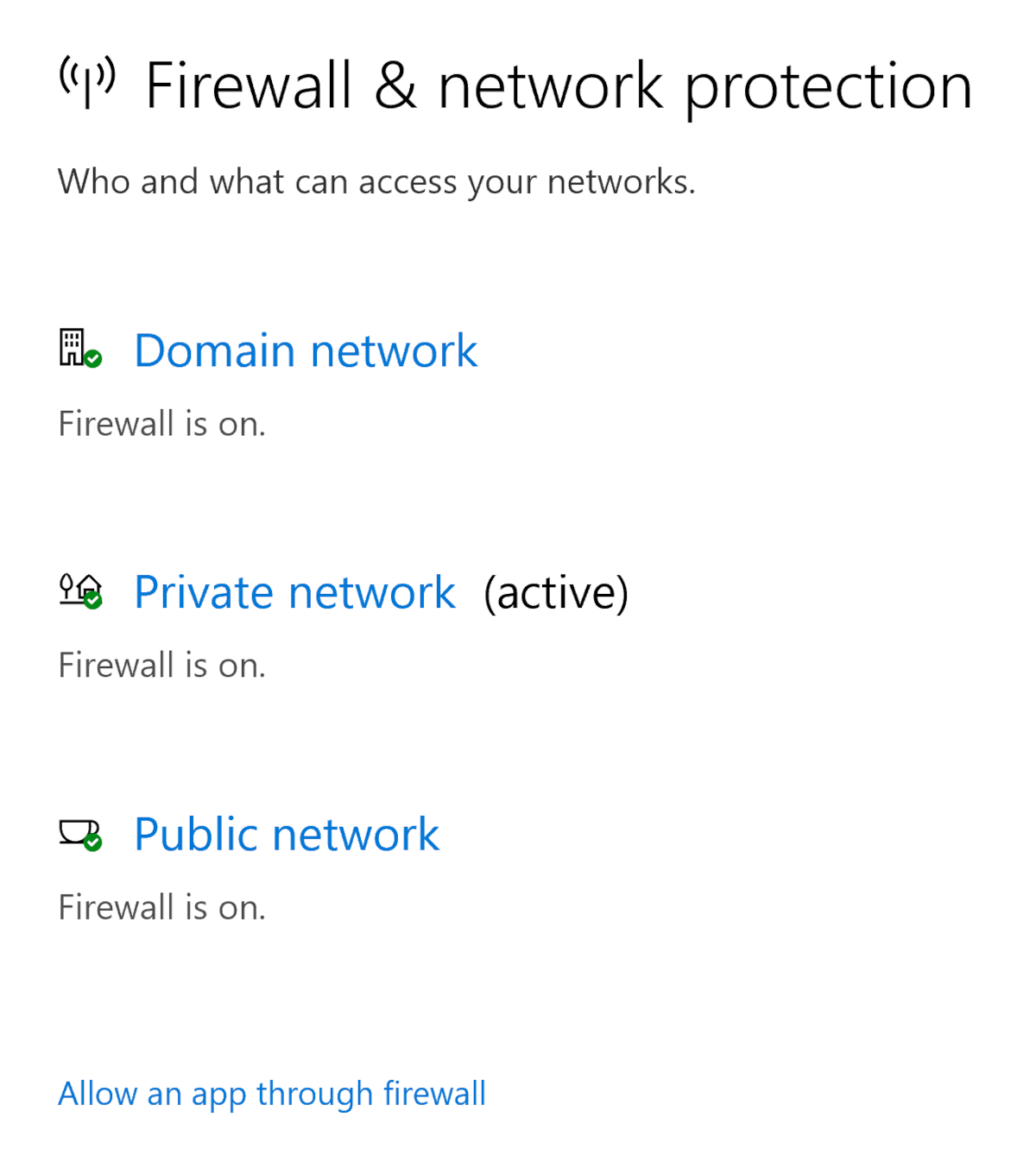 You can also disable the firewall for certain types of networks from the Firewall & network protection menu screen.Â