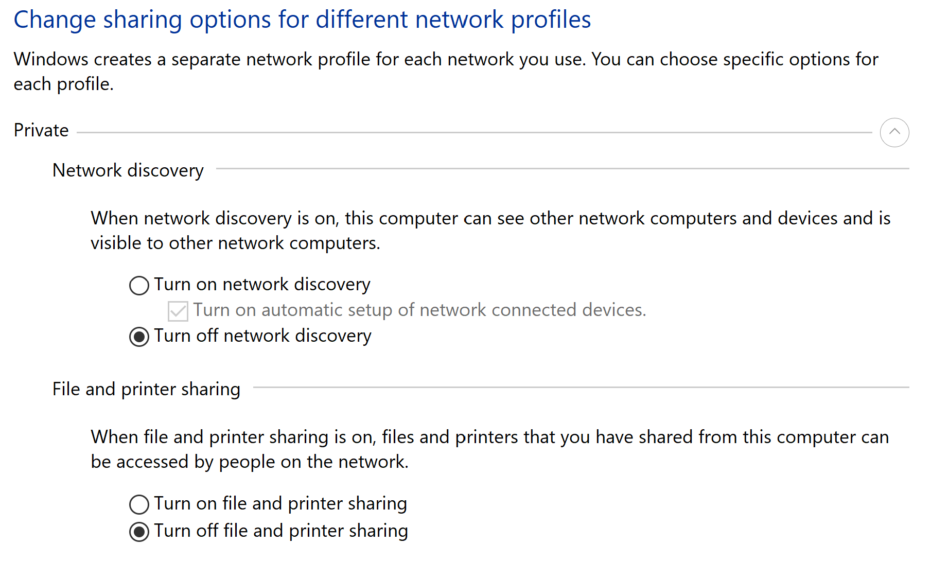 To control network discovery, expand the type of network you’d like to change settings for and make your changes. The choice is binary: turn discovery on or off. When it’s on, other devices can see your PC. When it’s off, they can’t.