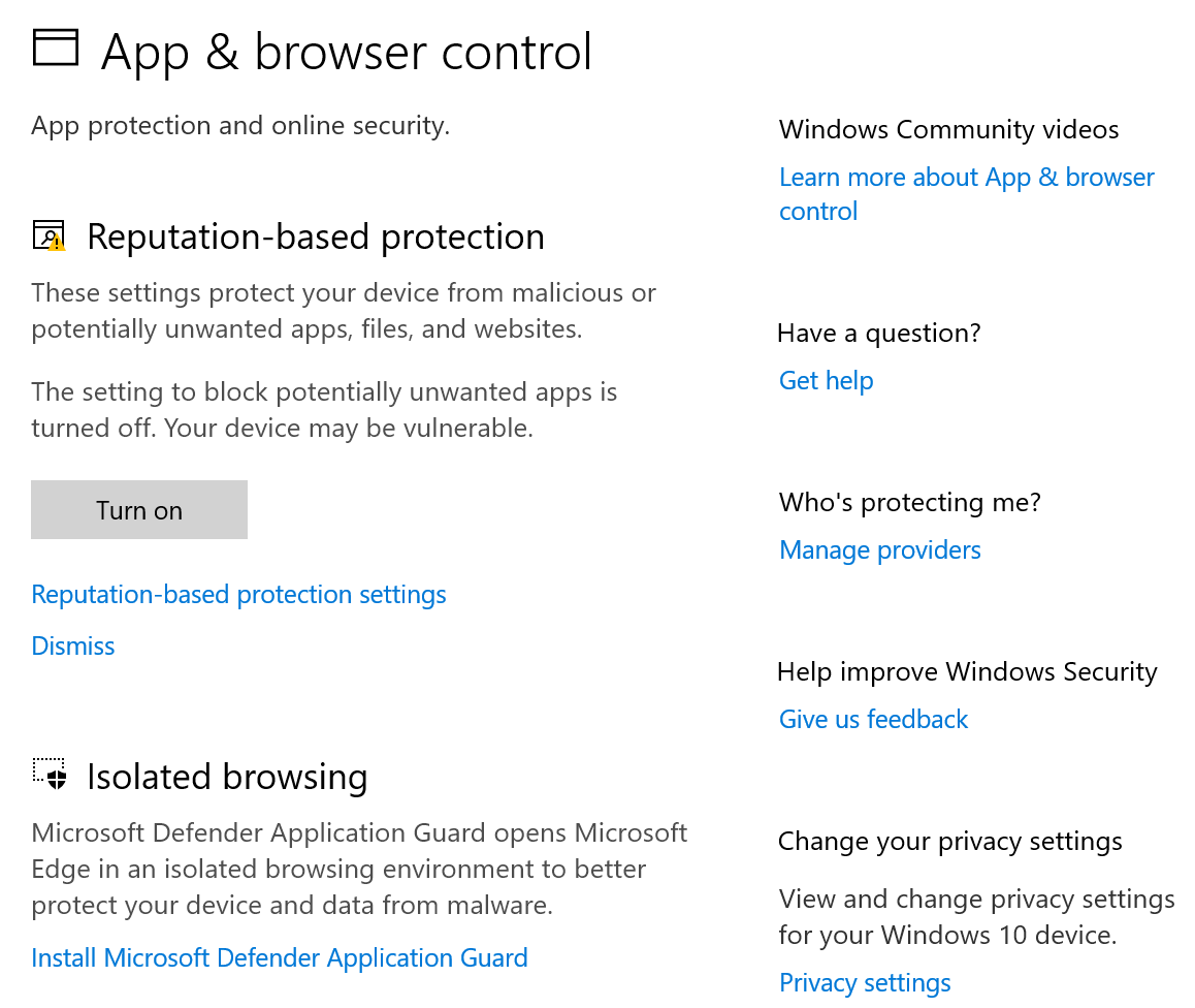 You might discover reputation-based protection is off, which you can turn on with a single click or tweak in more detail using the link below the ‘turn on’ button.