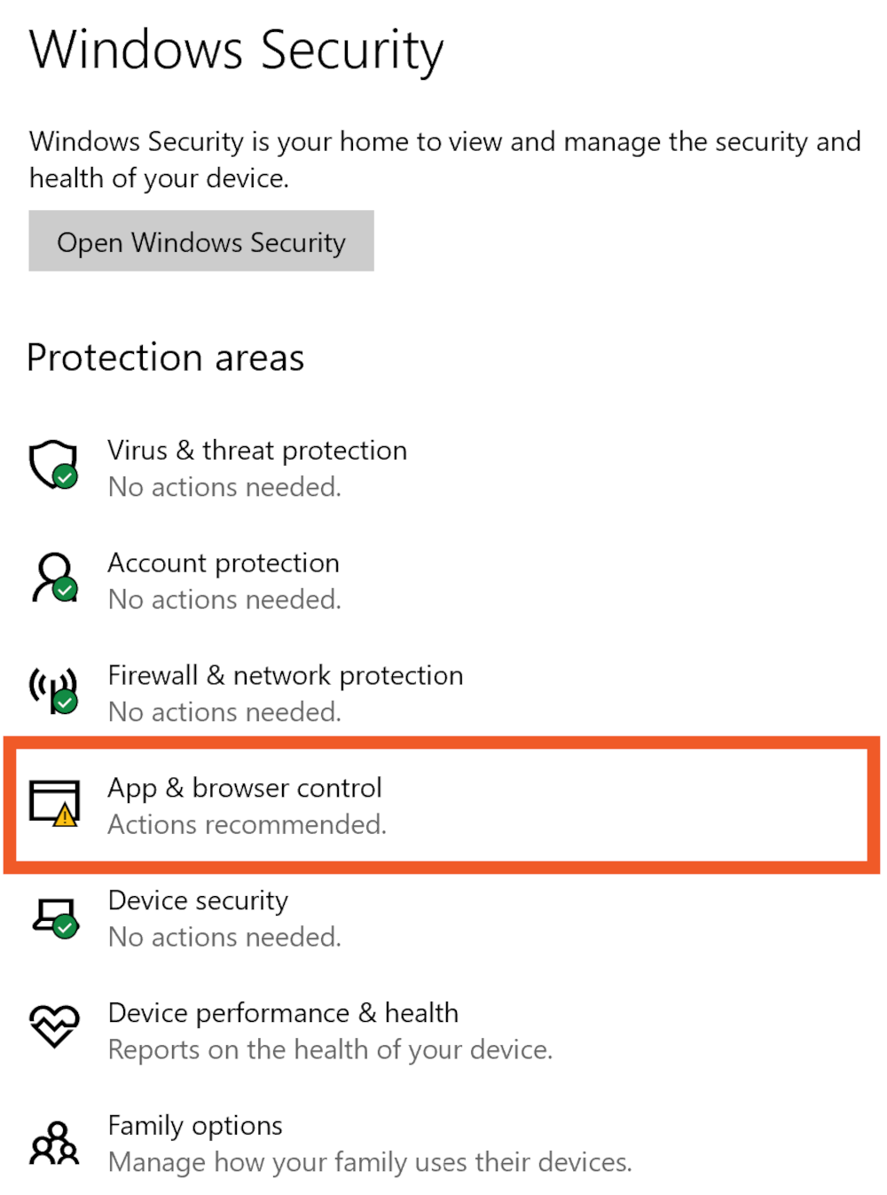 For example, if the app and browser control section has a yellow symbol with an exclamation mark, click on it to find out why.Â