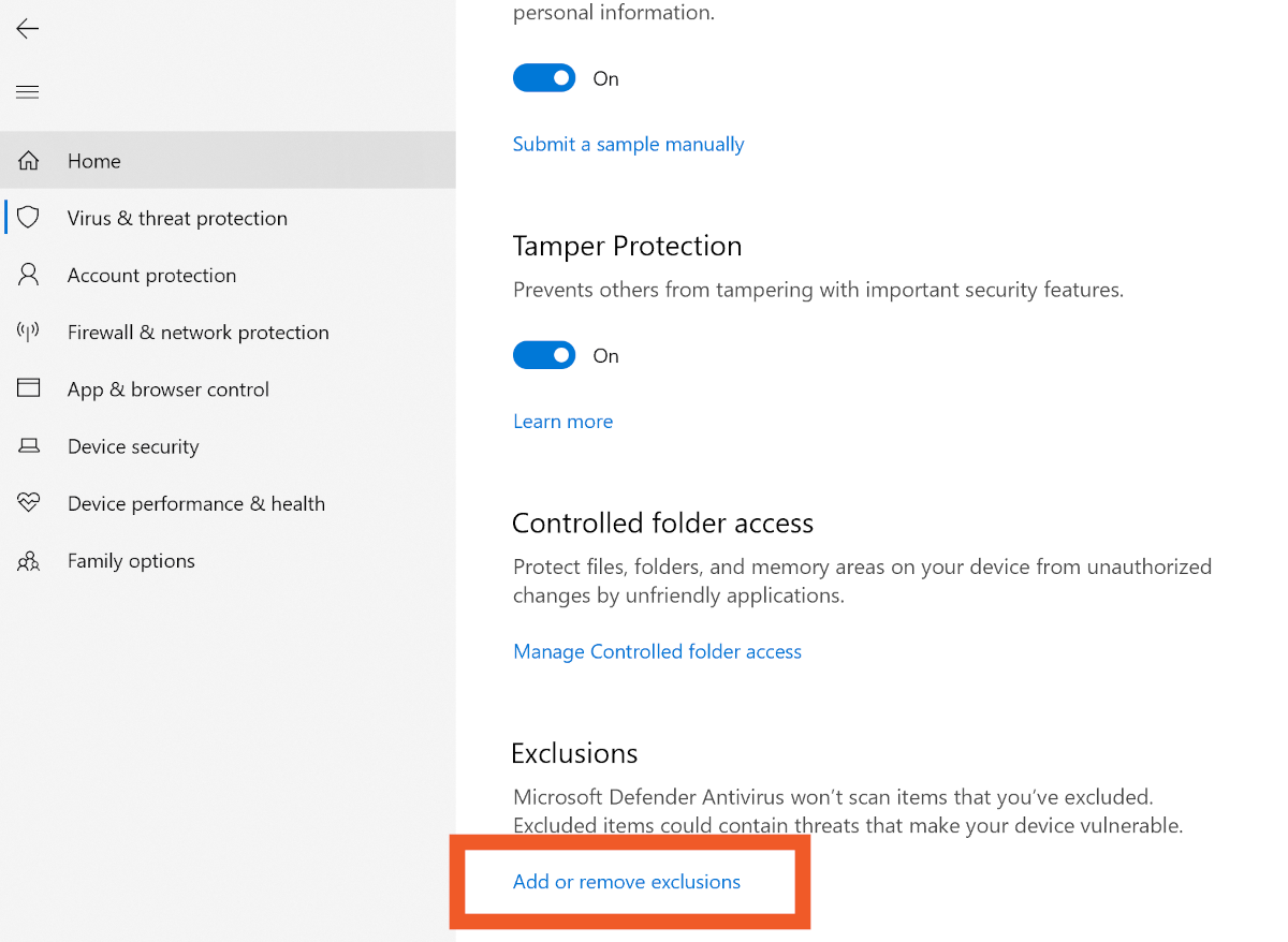 You can set up permanent exclusions for specific files, folders, file types and processes so they’ll never be scanned. Click on Virus & threat protection settings, then scroll down to Add or remove exclusions. Of the four choices, File and Folder are self-explanatory and easy to navigate.