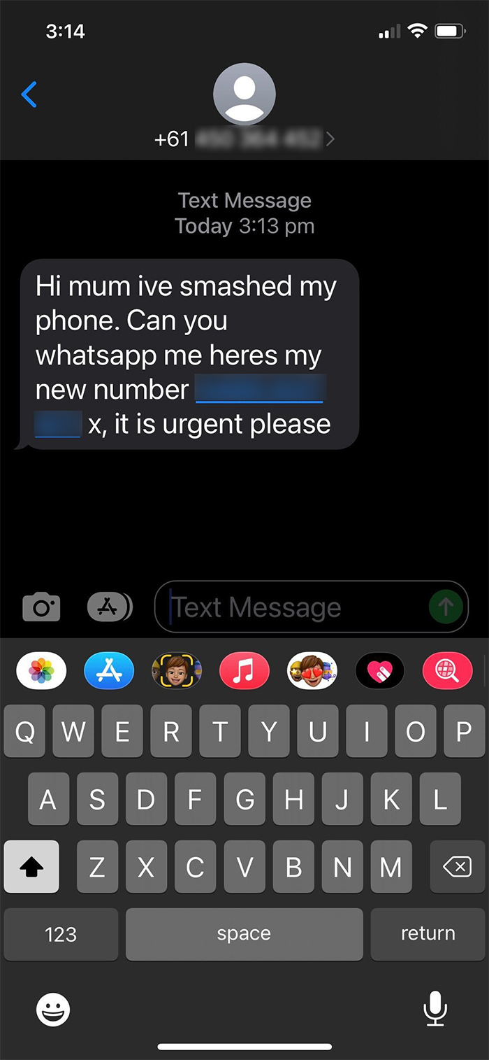 - An SMS message that appears under legitimate texts you’ve received from business or government, but has different wording or phrasing to the previous messages, or includes different contact details.