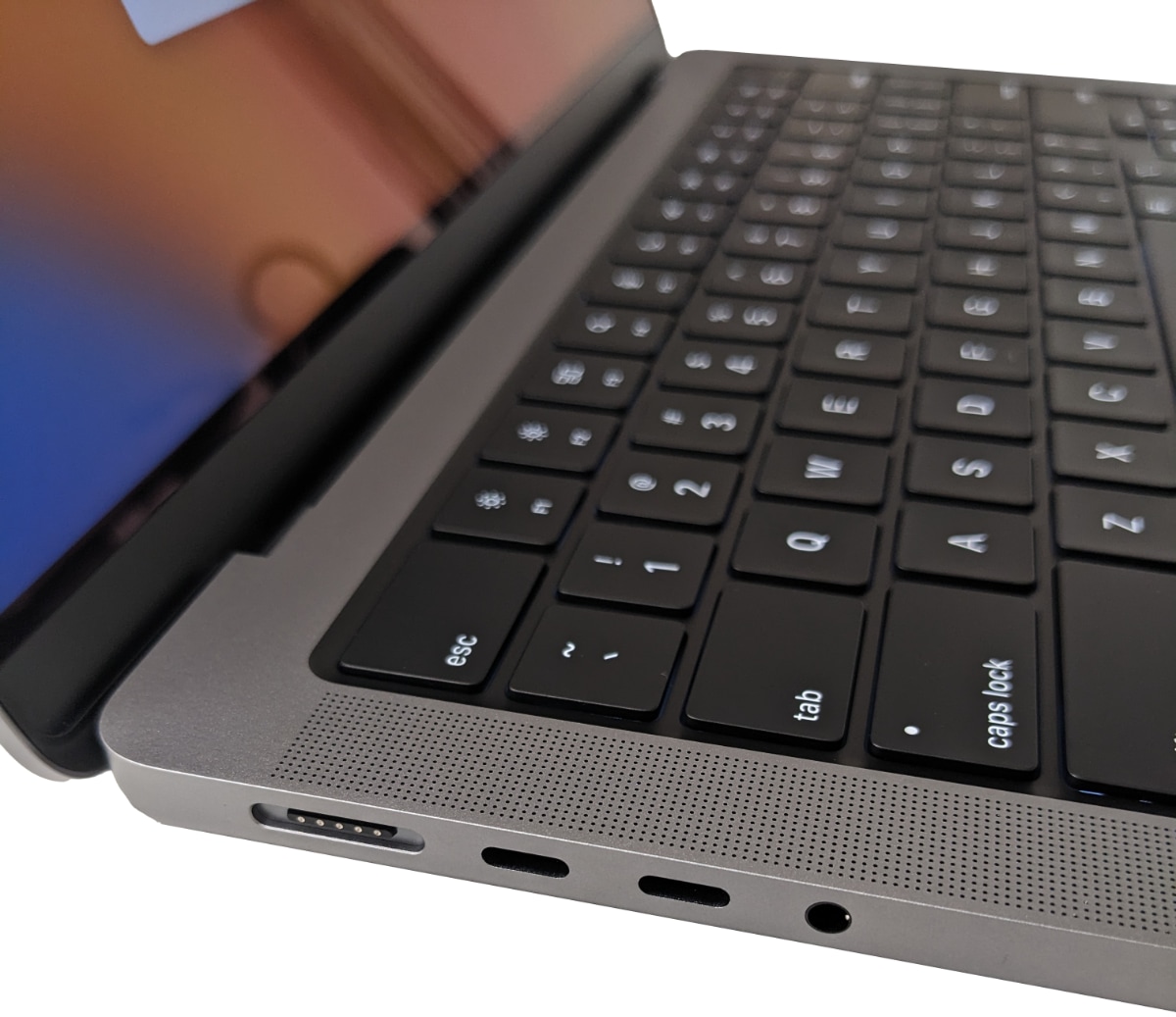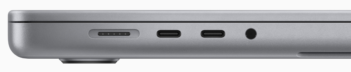 The left-hand side has the MagSafe 3 charging port and two USB-C Thunderbolt 4 ports, plus a headphone jack.