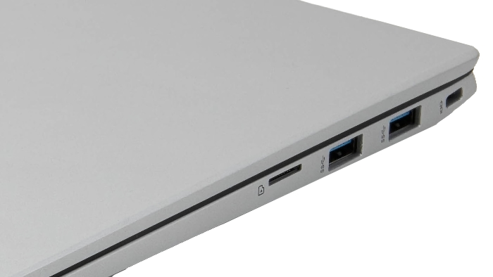 Two USB 3.2 Type-A ports and a microSD card slot on the right, plus a security lock slot.