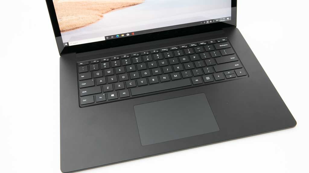 The palm rest is covered in Microsoft’s favourite dress material, Alcantara, in a choice of several colours to match the body. The keyboard handily includes buttons for power and volume control. We found the large touchpad smooth to use and accurate.