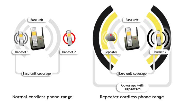 In an effort to extend cordless phone coverage, some companies have introduced ‘repeating technology’ to push the overall phone coverage beyond the limit of the main base station.Â