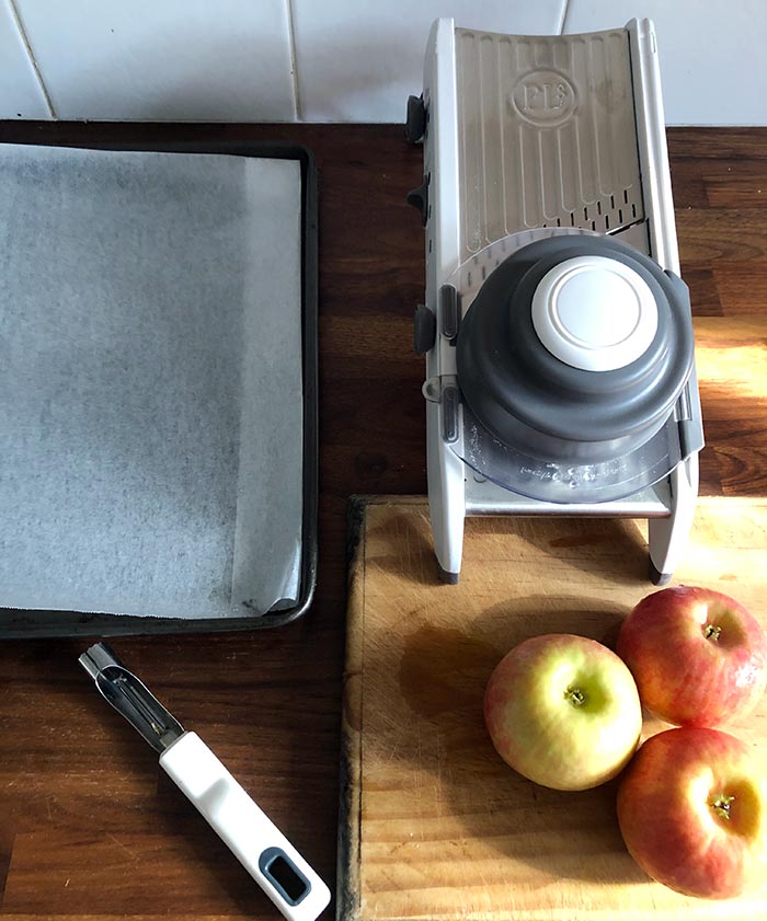 - Slice thinly (2mm thick) using a very sharp knife, a mandolin or food processor (you will need to cut the apple to fit the chute, then slice using the finest slicing disc).