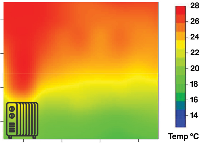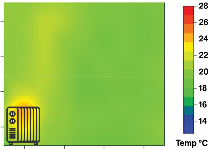 We used a convection heater consuming 1.67kW of power to maintain a temperature of 18.5°C. The heatmap is pictured. Note that most of the hot air is too high to be useful if you’re on the sofa watching TV.