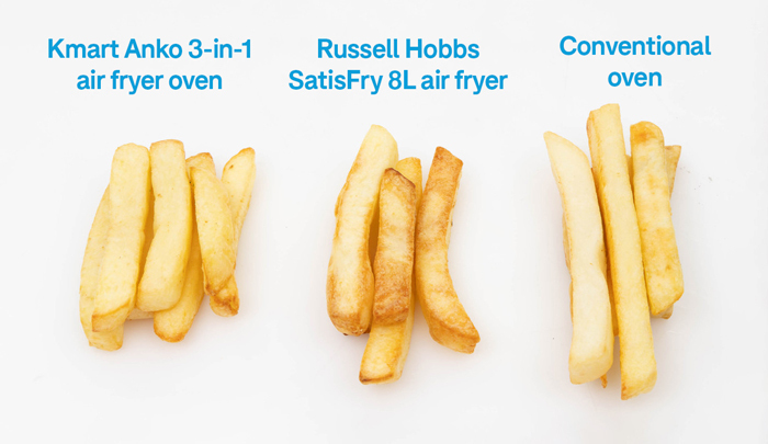 • The Kmart Anko 3 in 1 Airfryer Oven ($119) has a rotating basket accessory and a pre-programmed setting for cooking chips, which we used. This setting specified cooking the chips for 18 minutes at 200°C.