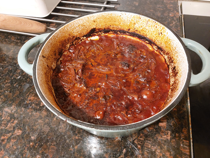 Once everything was nicely browned, I put the lid on and transferred the whole thing to the oven on a low heat. After six hours I turned up the heat and removed the lid to let the top brown up for a couple more hours.