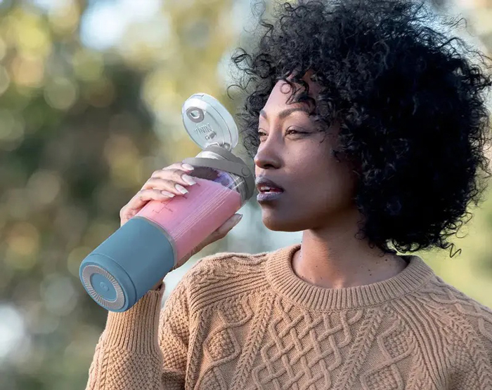 You can’t separate the rechargeable base from the container, though, so you’ll need to take the whole unit with you. I think it’s slightly too heavy to pop in your backpack if you have to carry it over a long distance, but it does fit in the cup holder of my car so it’s useful if you want to whip up a fresh smoothie on a car trip.