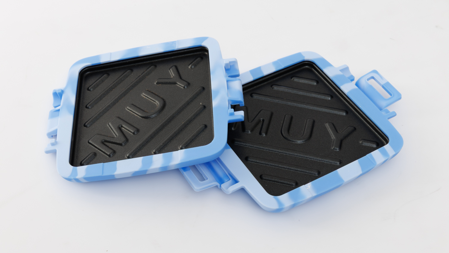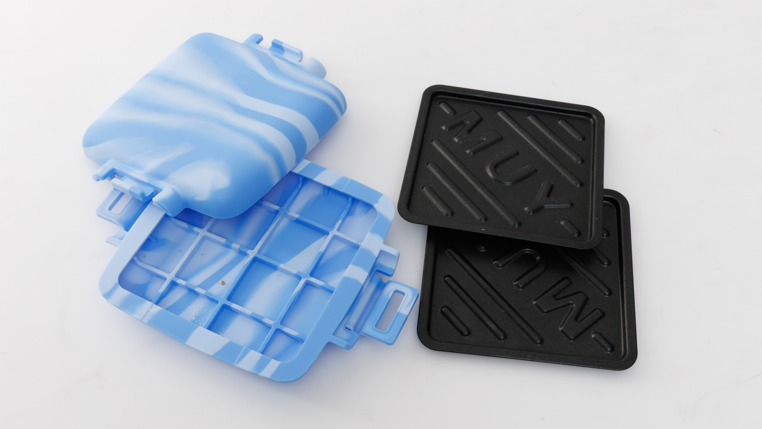 The Kmart Microwave Toastie Maker consists of two non-stick coated plates on the interior surfaces and a soft silicone exterior casing.