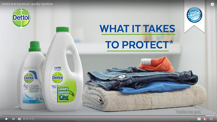 The last frame of a YouTube ad for Dettol laundry sanitiser depicts bottles of the product and the words, “WHAT IT TAKES TO PROTECT*”. Small text in the bottom corner add the caveat: “*Protection from germs”. Neither the video or Dettol’s Australian website mention protection from COVID-19.