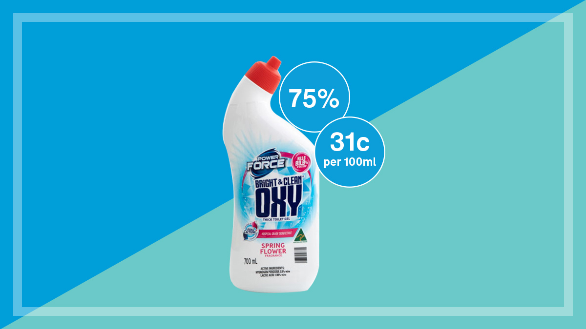 In happy news for budget-conscious cleaners everywhere, our top scorer in this category is also the cheapest – Aldi Power Force Bright & Clean Oxy Thick Toilet Gel, which scores 75% (our top score) and costs $2.19 / 31c per 100ml.