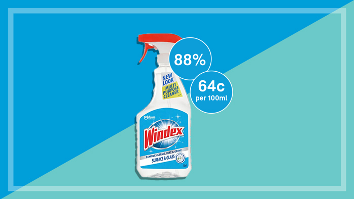 But if you’re after a cheaper cleaner that still performs well, Windex Surface and Glass Floral is the one to add to your shopping basket. It offers the best balance between cost and performance, setting you back $4.80 or 64c per 100ml, but with a great performance score of 88%.
