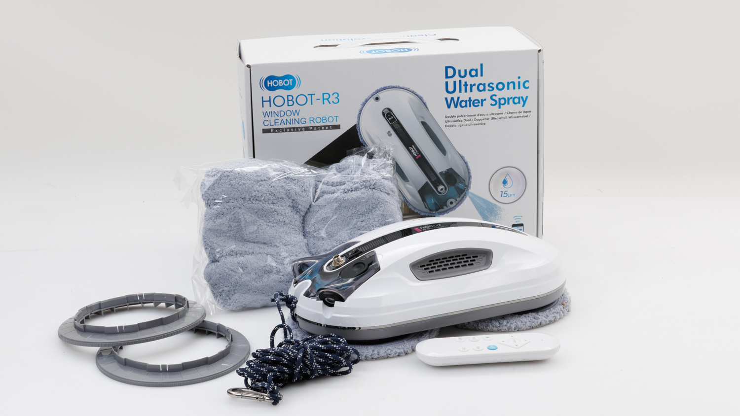 In the box you’ll get the window cleaner with tether, charging cable with AC adapter, remote control, 4 cleaning wheels (2 sets), 14 cleaning cloths (7 sets), 220ml detergent, 2 extra nozzles, user manual and a quick-start guide.