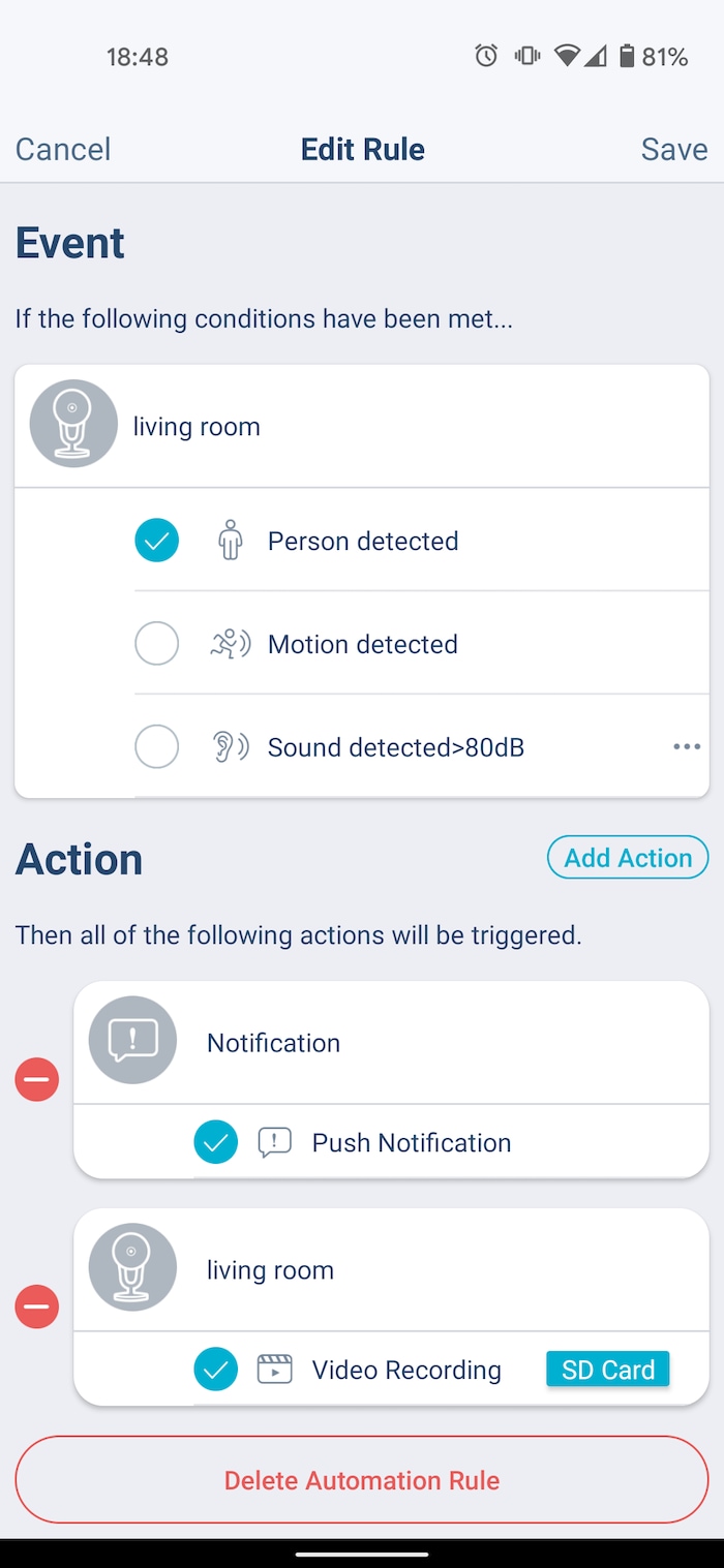The app lets you set up customised “scenes”, so for example you could set a scene that tells the camera not to record when you’re home (privacy mode) and to instead record when you’re away.