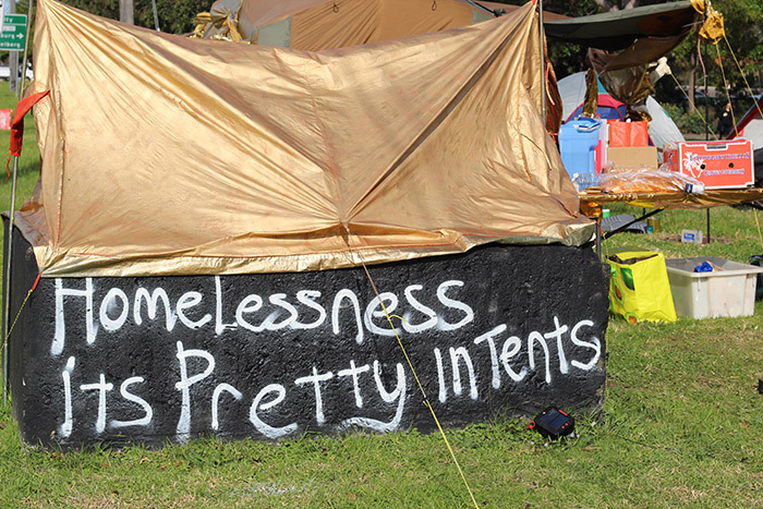 A median strip on a busy Melbourne peak-hour thoroughfare has been transformed into a mini tent city for National Homelessness Week, with a small group of protesters trying to draw attention to the housing and homelessness crisis.Â