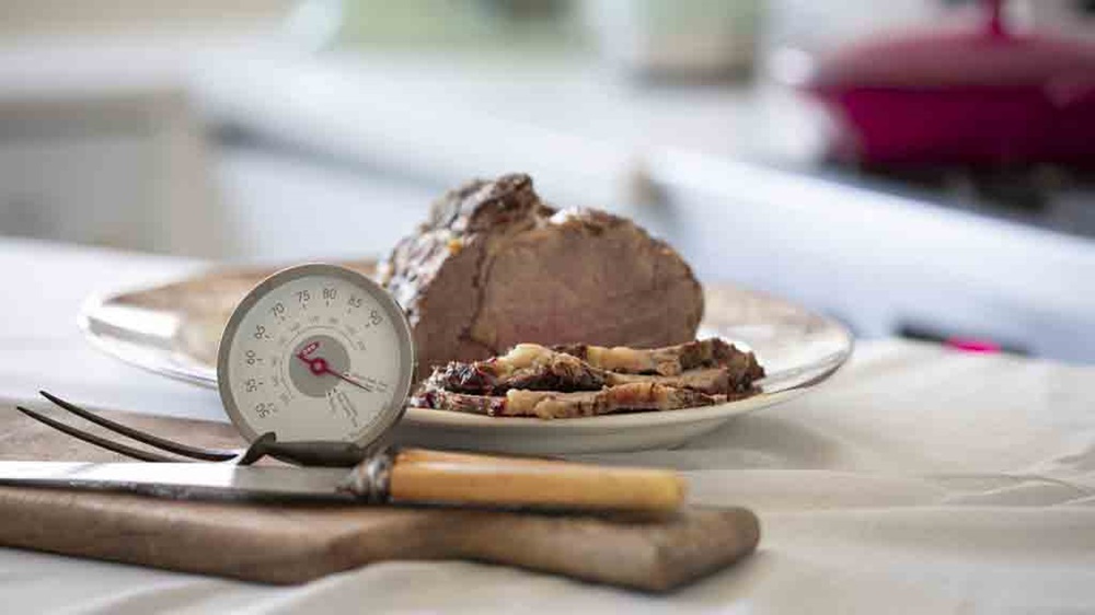 Take the temperature in the thickest part of the food, as close to the centre as possible. Make sure the thermometer doesn’t touch gristle, bone or fat – these will give a false reading.
