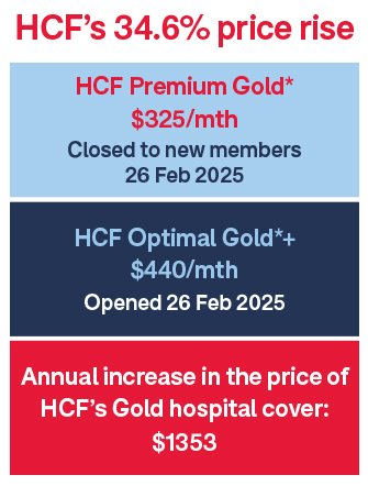 On 26 February this year, the day the health minister announced the 2025 health insurance increase, HCF released Optimal Gold with a NSW premium of around $440 per month for a single person, and closed to new members its Premium Gold policy that cost $325 per month.