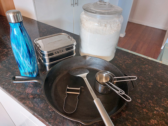 - stainless steel kitchen accessories like spatulas, tongs, measuring cups and vegetable peelers