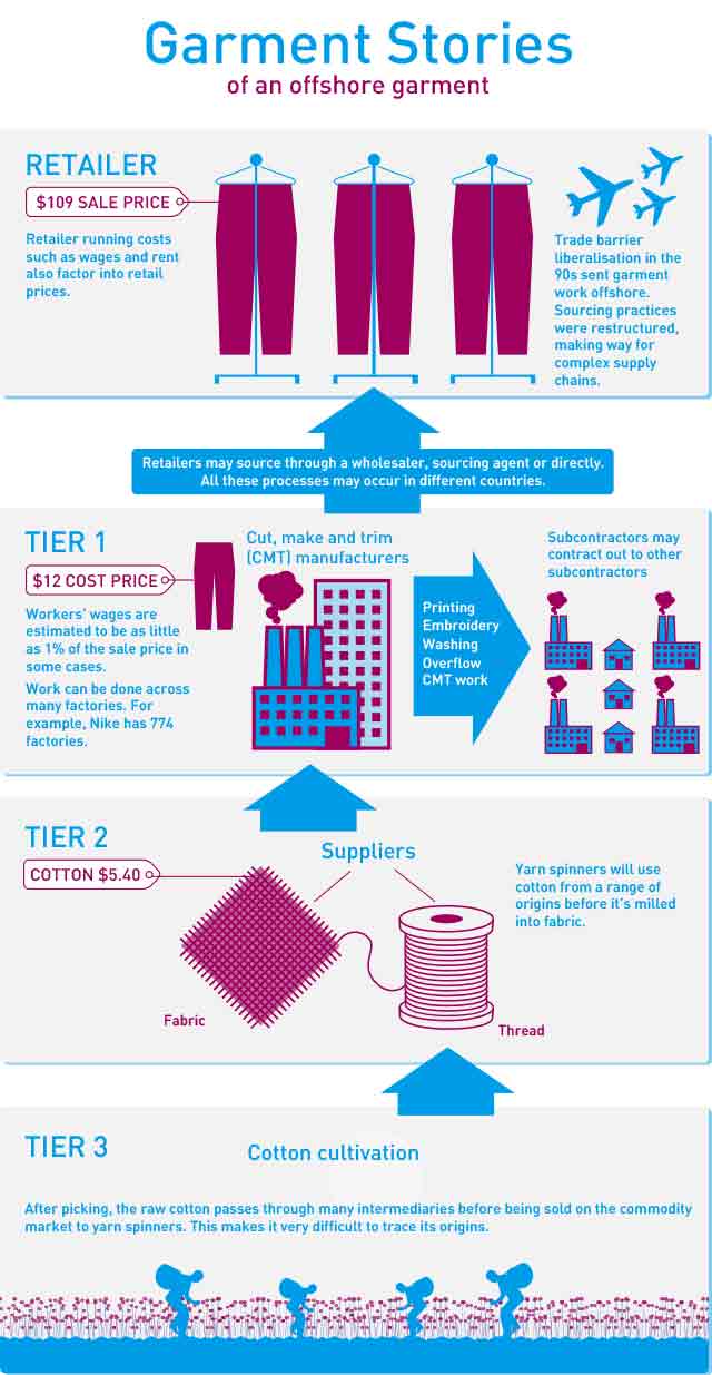 Brands source clothing by bargaining with suppliers on price. This price usually equates to 10–20% of the retail price and includes everything involved in the garment’s production up to the point of shipping, including fabric, manufacturing and middlemen’s profits. Macquarie Bank research estimates such production costs for a pair of jeans retailing for $US109 to be $US12.