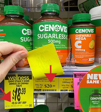 Lifting the tag revealed the usual shelf price for this product didn’t match the RRP