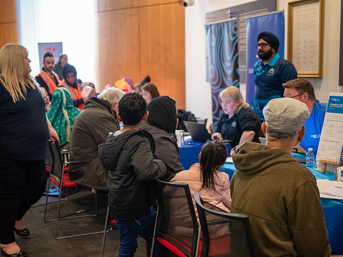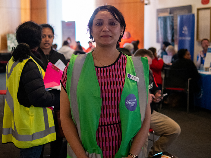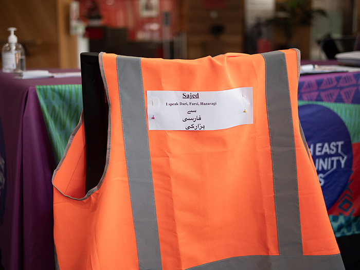 A small army of volunteers in fluorescent orange and yellow hi-vis jackets buzz around the room approaching people as they enter. Printed on the back of their vests: “I speak Dari, Farsi, Hazaragi”, “I speak Punjabi”, “Hindi”, “Burmese”, “Urdu”.
